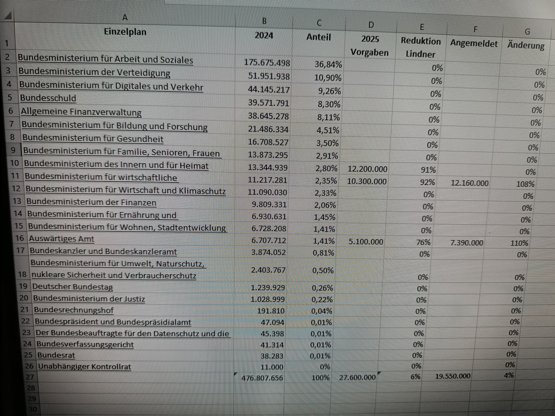 Hallo Community ich bin ein bisschen am verzweifeln. Mag sein dass ich auch meine digitale Bildung vernachlässigt habe, aber ich finde im Netz keine Tabelle oder Angaben, in welcher Höhe Christian Lindner für die einzelnen Ministerien nun die Vorgaben gemacht hat.