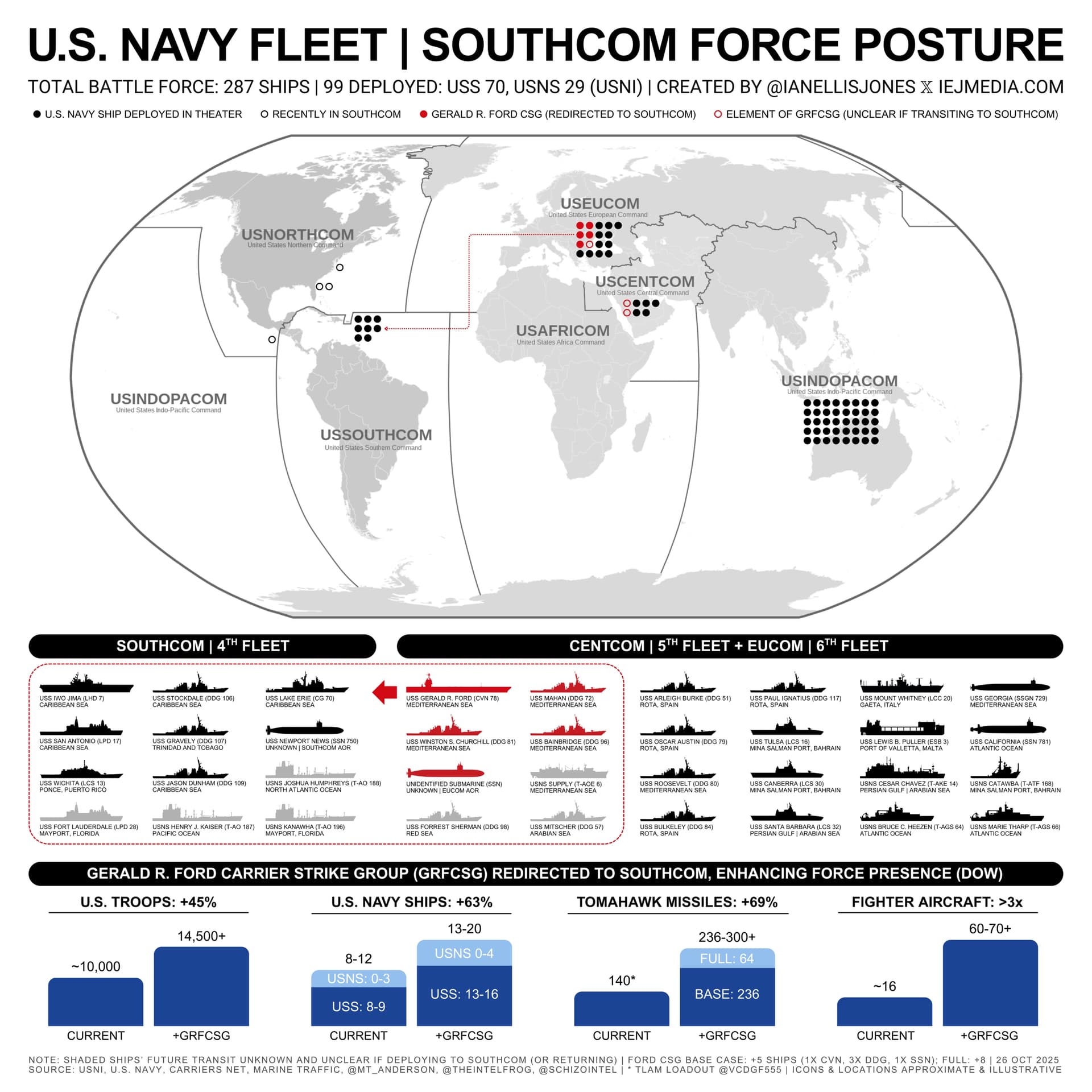 Ganz konkret ist die USS Gerald R. Ford (der modernste Flugzeugträger der Welt) mit ihrer Kampfgruppe Berichten zufolge (s.u.) aus dem Mittelmeer ausgelaufen und Richtung Karibik unterwegs. Sie soll voraussichtlich in der kommenden Woche eintreffen, sich dem U.S. Southern Command (SOUTHCOM) anschließen und die bereits beachtliche Präsenz der US-Navy weiter verstärken.