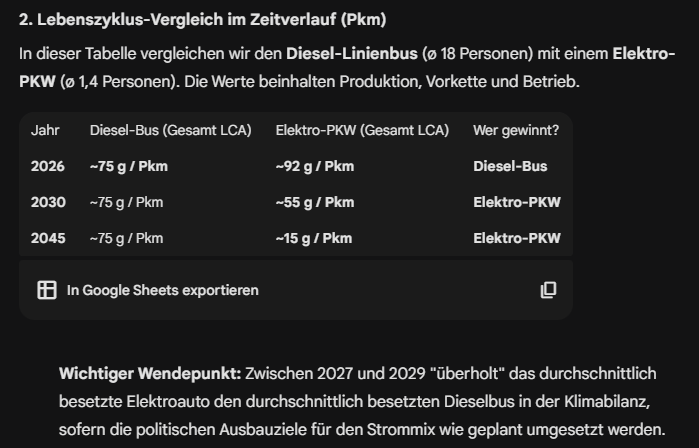 Habe keine direkte Quelle. Welche spuckt chatti aus? Finde immer nur Vergleiche, die nicht Umstieg von Auto auf Bus untersuchen sondern Bus Diesel mit Bus Elektro und Diesel Auto mit E Auto vergleichen. Das stelle ich auch gar nicht zur Diskussion.