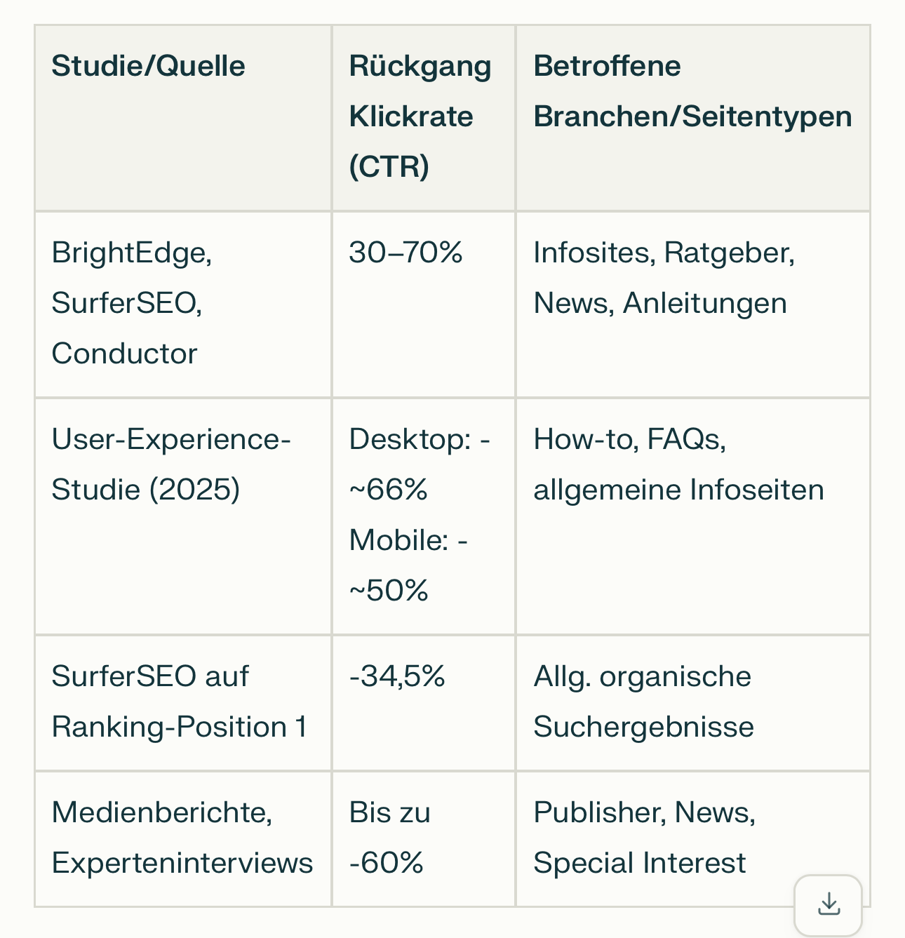 Website-Traffic sinkt im Durchschnitt um 30–70%, wenn KI-Zusammenfassungen für eine Suchanfrage angezeigt werden. Der Einbruch hängt stark vom jeweiligen Suchbegriff und der Absicht der Nutzer ab[1][2][3][4].