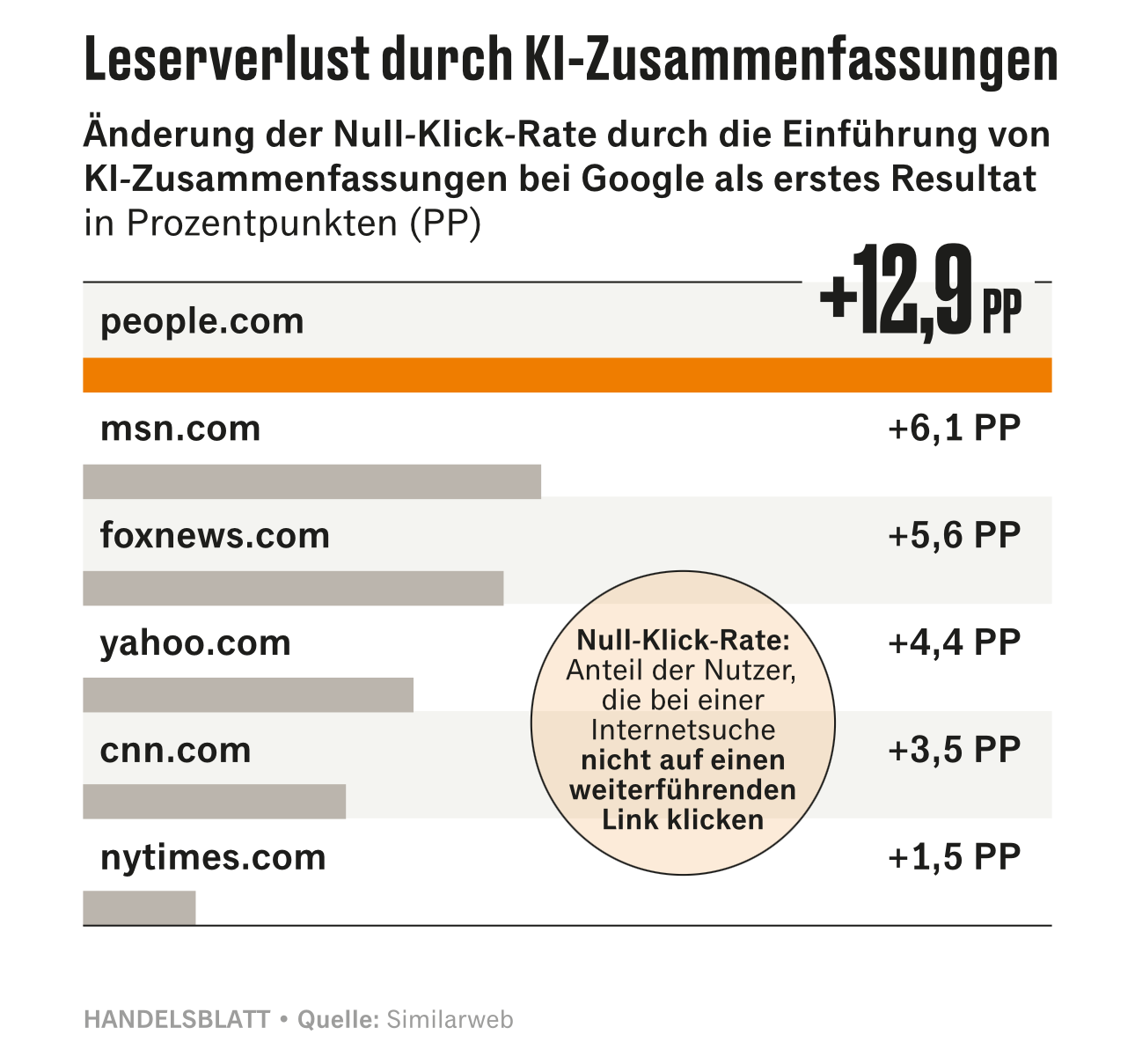 Gefährdet ist auch das bisherige Geschäftsmodell digitaler Medienhäuser, das stark auf Werbung und Nutzerzahlen durch Google-Traffic basiert.