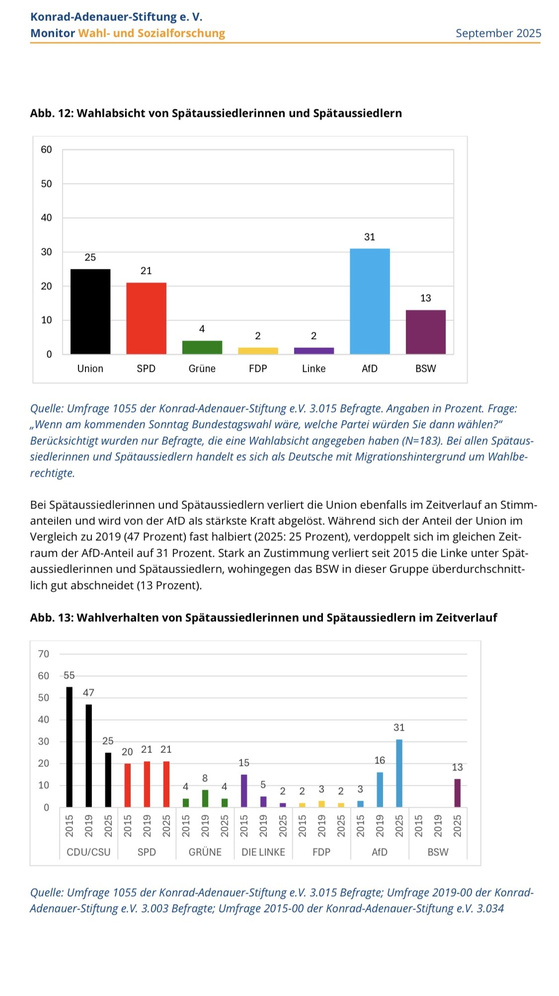 Ich stimme dir da grundsätzlich zu. Allerdings erscheint es mir nicht fernliegend, dass die hohen Zustimmung zur AfD unter Spätaussiedlern (zumindest auch relevant) herkunftsspezifische Gründe hat (Russland/Putinnähe). Dass bei Spätaussiedlern die AfD beliebteste Partei ist, geht auch aus der oben angefügten Studie hervor. (Edit: auch die vergleichsweise hohen Zustimmungswerte für das BSW lassen herkunftsspezifische Gründe vermuten.)