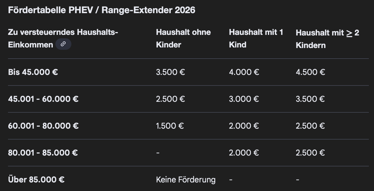 Die Förderung für PHEVs ist immerhin niedriger als für reine BEV. Glaube maximal 4.500 €.