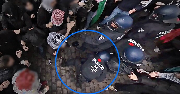 Ein Beamter zieht eine Person aus der Menge und fixiert sie am Boden, währenddessen sind seine Kollegen um ihn herum im Gerangel mit anderen Demonstranten, von denen einer über den knienden Beamten fällt. Der Beamte steht auf, schlägt dann aggressiv nach mehreren Demonstranten und zieht sich irgendwann zurück. Es stellt sich heraus, dass er sich im Zuge dieser ganzen Aktion die Hand gebrochen hat. Ob das beim Herausziehen der Person aus der Menge, im Gerangel mit der am Boden liegenden Person (z.B. dadurch, dass ihm jemand auf die Hand getreten ist) oder in dem Handgemenge danach geschehen ist, ist unklar.