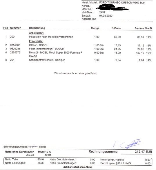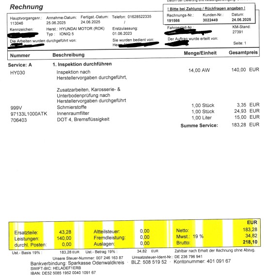 Ich habe mal einen tatsächlichen Vergleich. Im September 2022 eine Inspektion in einer freien Werkstatt bei einem Verbrenner. Und eine Inspektion eines E-Autos in einer Vertragswerkstatt im Mai 2025. Wenn man da noch die Inflation und die Unterschiede Vertragswerkstatt/Freie mal reinrechnet, ist das ein No-Brainer: