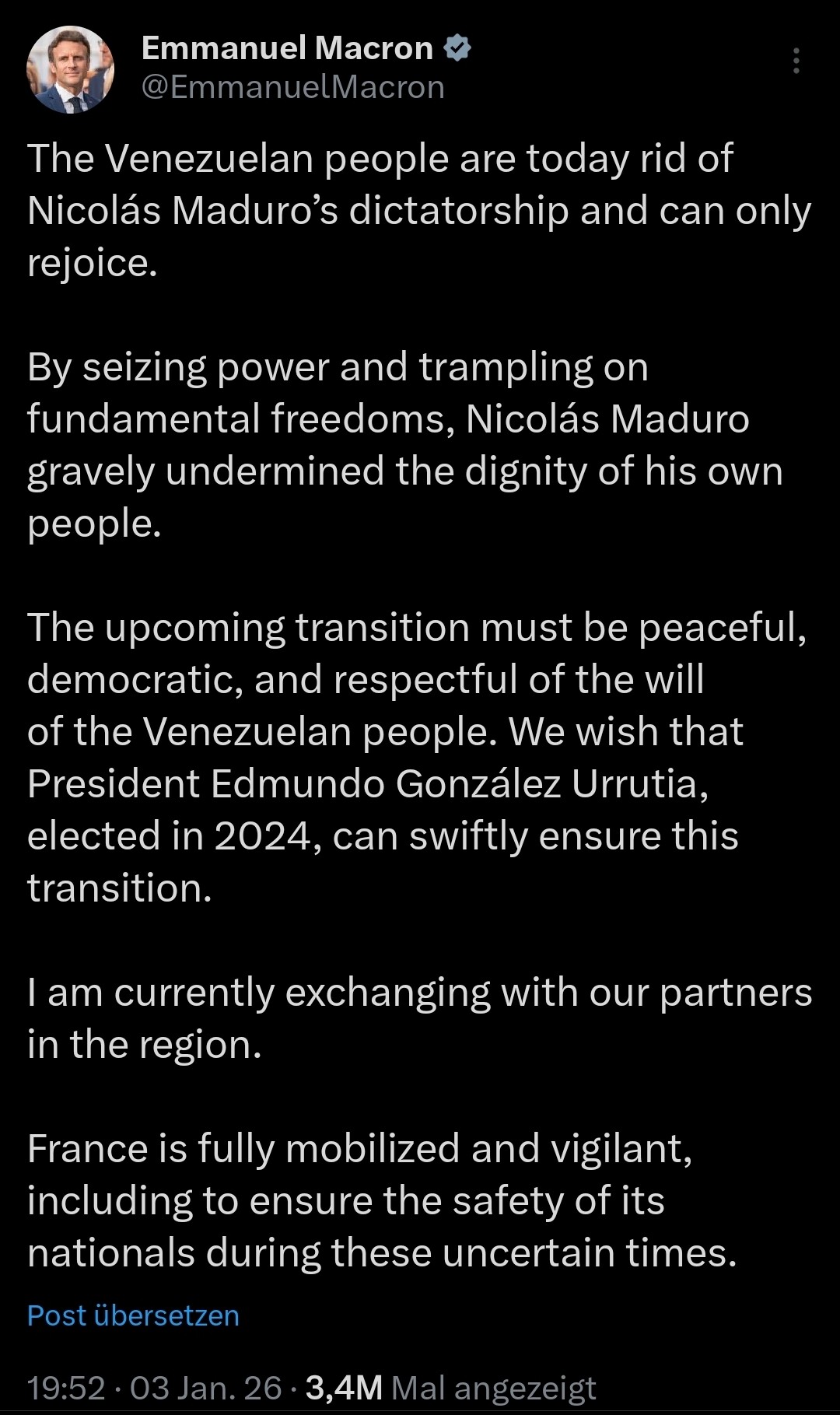 The Venezuelan people are today rid of Nicolás Maduro’s dictatorship and can only rejoice. By seizing power and trampling on fundamental freedoms, Nicolás Maduro gravely undermined the dignity of his own people. The upcoming transition must be peaceful, democratic, and respectful of the will of the Venezuelan people. We wish that President Edmundo González Urrutia, elected in 2024, can swiftly ensure this transition. I am currently exchanging with our partners in the region. France is fully mobilized and vigilant, including to ensure the safety of its nationals during these uncertain times.