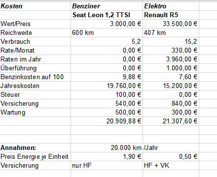 Auto 2 (Größe vergleichbar): Renault 5 e Comfort Range; Neupreis 33.500€; Reichweite 407 km WLTP; Verbrauch 15,2 kw/H je 100 km; Versicherung HF + VK, weil Leasing; Rate im Monat rund 330€;