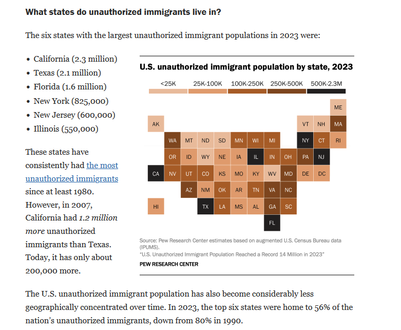 Ginge es wirklich darum, müsste sich Trumps uniformierte Terrortruppe eigentlich auch in “roten” Staaten mit hohen Zahlen an Migranten ohne Papiere herumtreiben, oder?